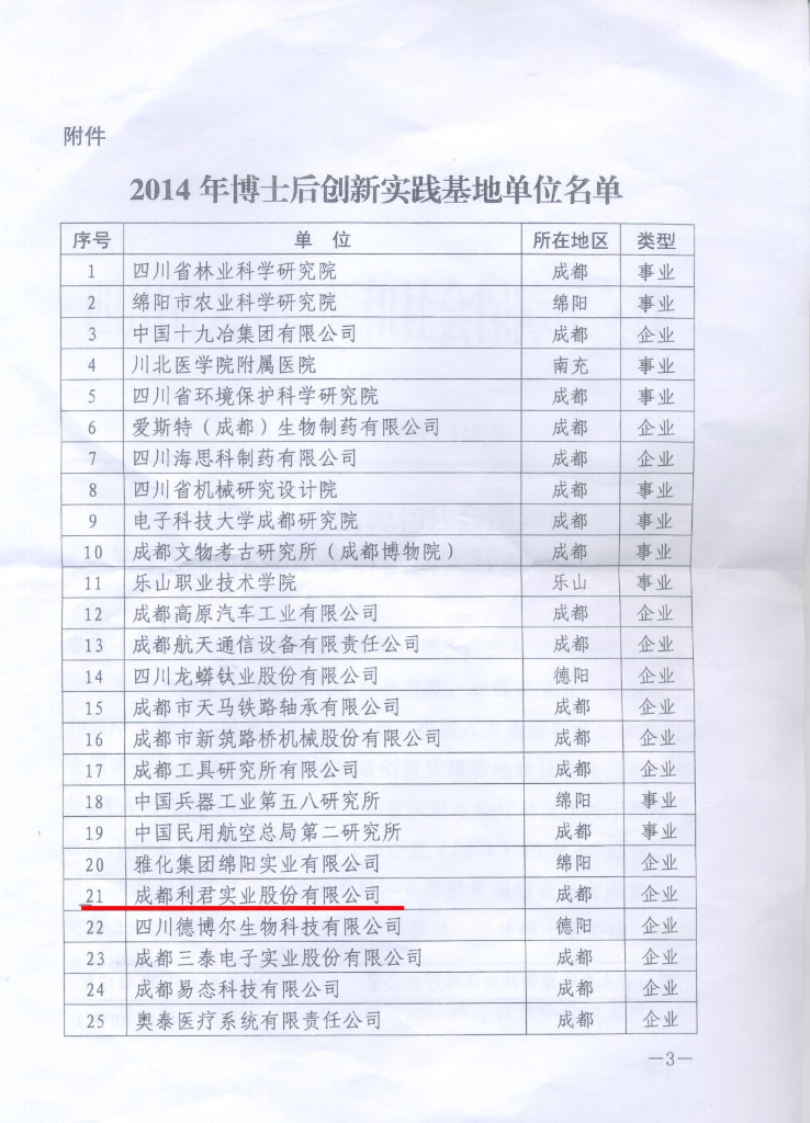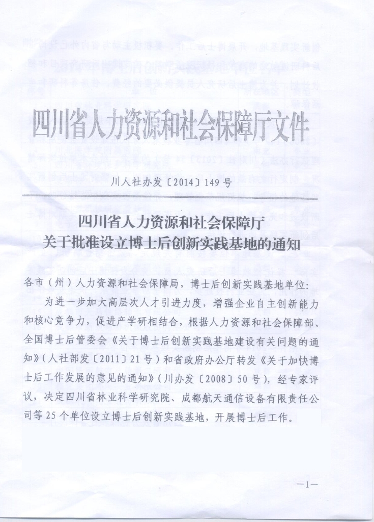 公司于2014年6月30日獲得四川省人力資源和社會保障廳批準的博士后創新實踐基地。
