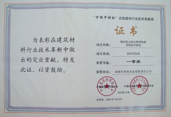由“中國建筑材料聯合會”和“中國機冶建材全國委員會”舉辦的“中國中材杯”全國建材行業技術革新獎評比中,我公司“輥壓機水泥生料終粉磨系統技術研發項目”榮獲一等獎。12月19日公司派代表前往人民大會堂參加頒獎儀式。